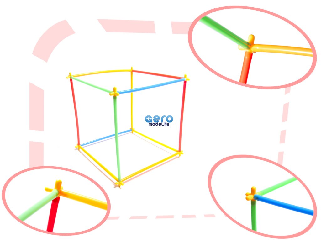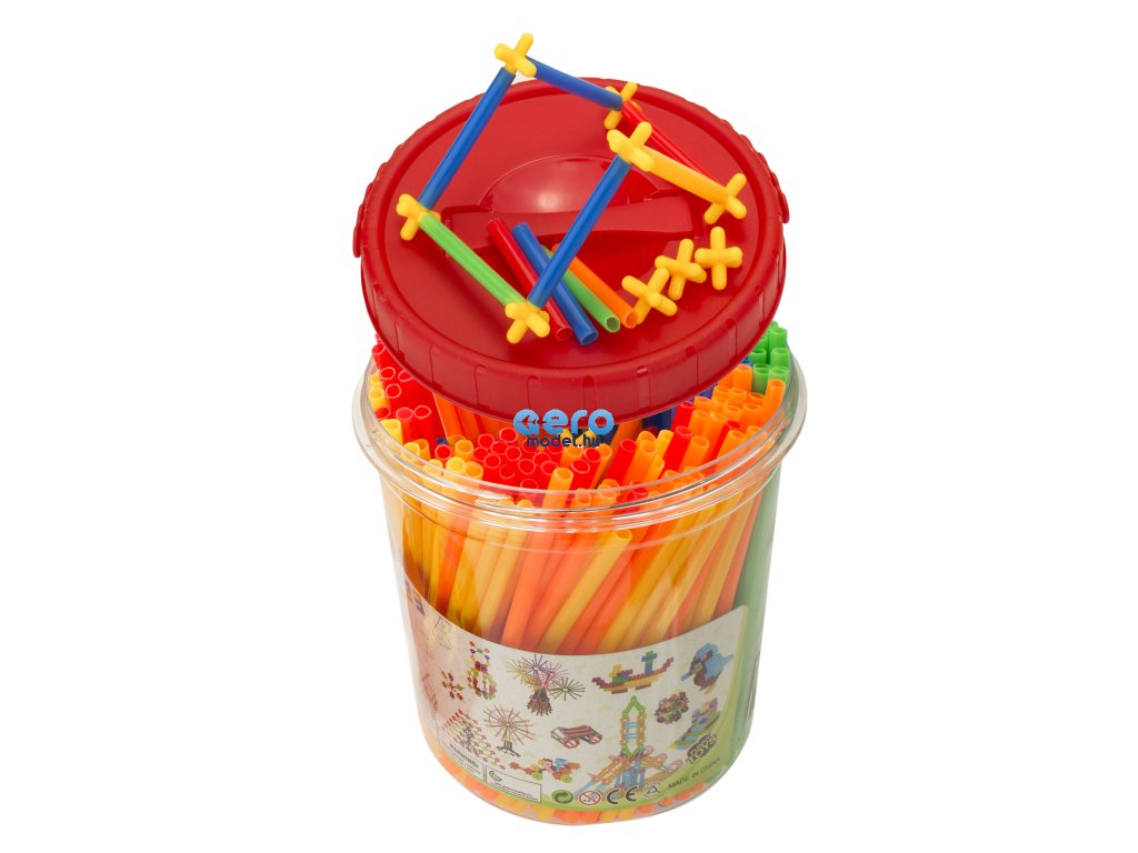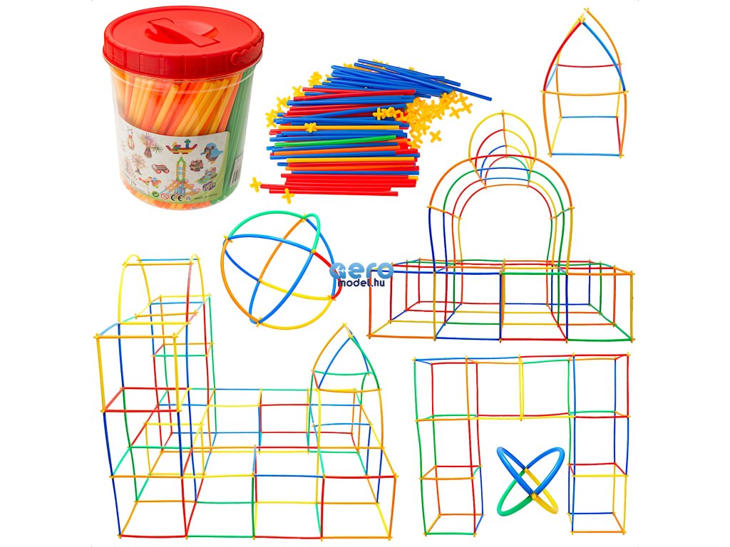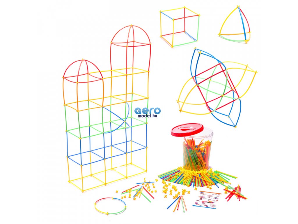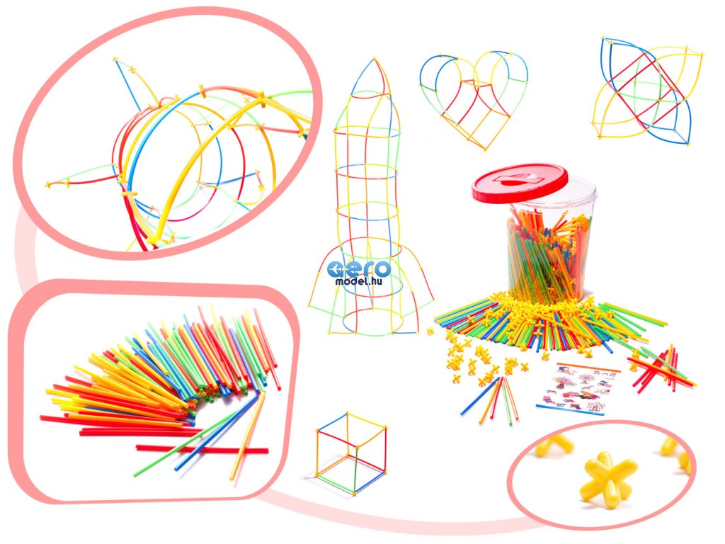 A csomag műanyag szívószálakat és műanyag kereszteket tartalmaz. A szívószálak keresztekkel történő összekapcsolásával különböző struktúrákat hozhat létre.