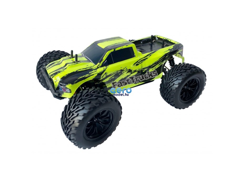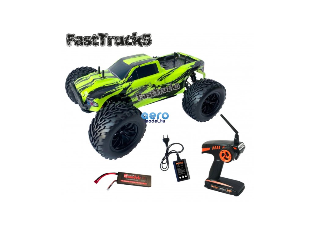 FastTruck 5 - Kiváló minőségű modell, amellyel beléphet a teljes értékű OFF ROAD modellek világába, és mindent megtanulhat az alváz beállításától a gyors vezetés tökéletes irányításáig! 1:10 méretarány, 415 mm hosszú, 4 WD meghajtó, erős váltómotor, WATERPROOF elektronika és szervovezérlés. A modell eléri a 60 km / h-nál nagyobb sebességet, és szórakoztatásra, valamint a verseny világába való belépésre tervezték. A gyártáshoz üvegszállal töltött minőségi anyagokat használnak. A modellnek teljesen állítható alvázával, állítható tengelykapcsoló-csúszkájával, nagy olajcsillapítókkal, fém differenciálművekkel van felszerelve, csapágyakkal teljesen felszerelve, acél féltengelyek CV-csatlakozókkal a leesés megakadályozására. Csak csomagolja ki a dobozt, töltse fel és induljon a kezdéshez!