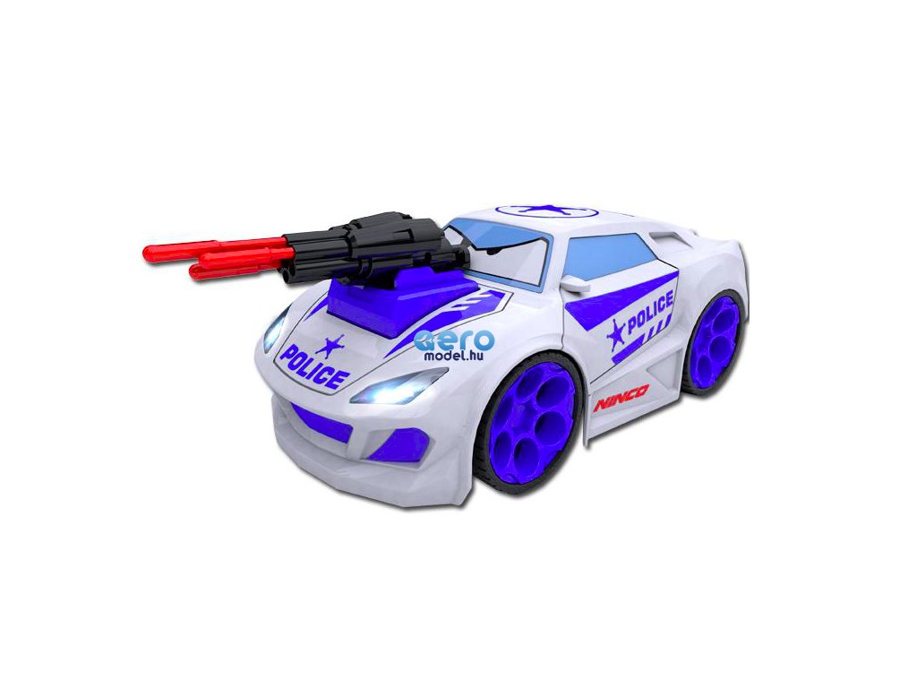 A csomag a Police Nincoracers távirányítós, hátsókerék-hajtású autó egy teljesen összeszerelt modelljét tartalmazza. Karkötőbe integrált jeladó. Hat géppuskalövés. Spanyol, angol, portugál, német, francia, olasz és cseh kézikönyv. A működéshez 3 db AA 1.5 alkáli elemet kell hozzávásárolni a modellhez és 2 db AAA 1.5V elemet a vezérlőhöz.