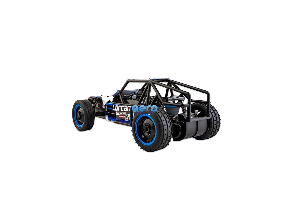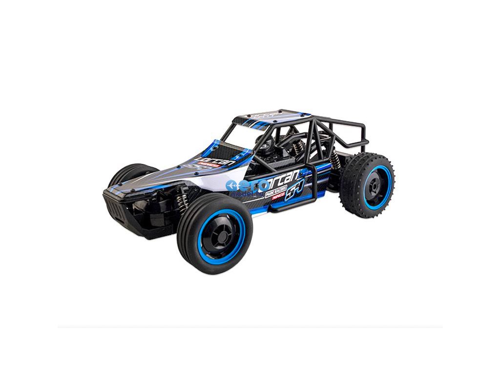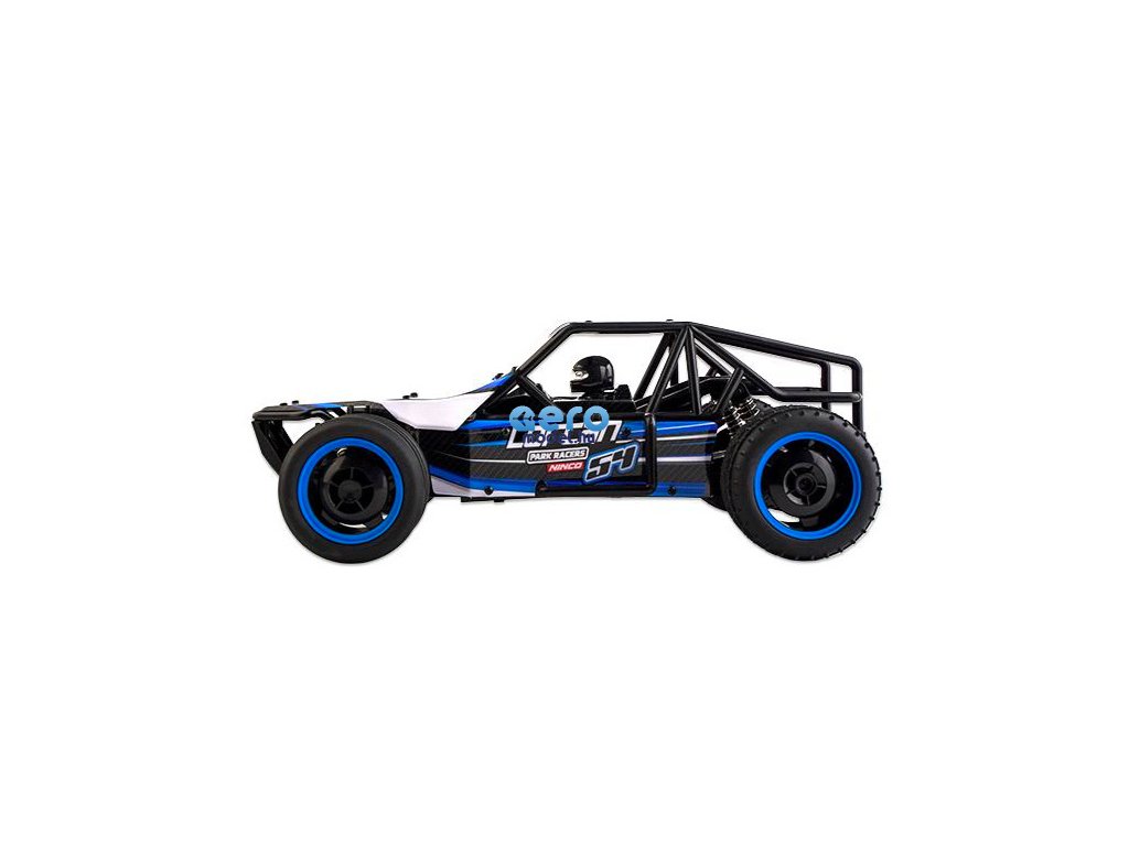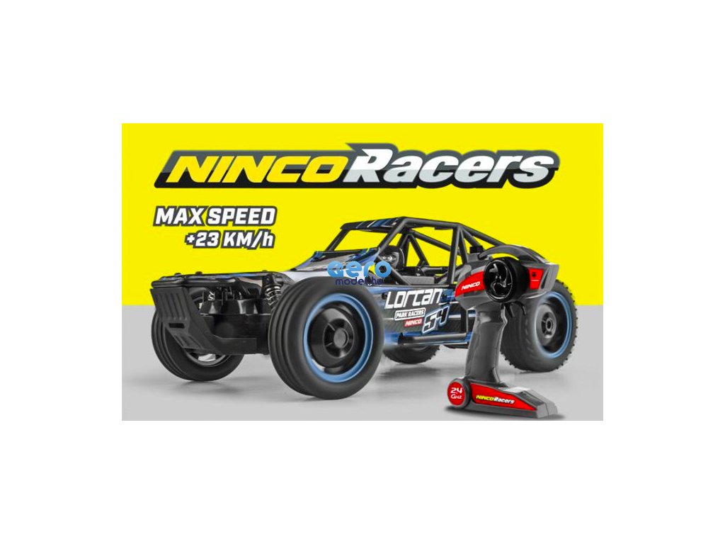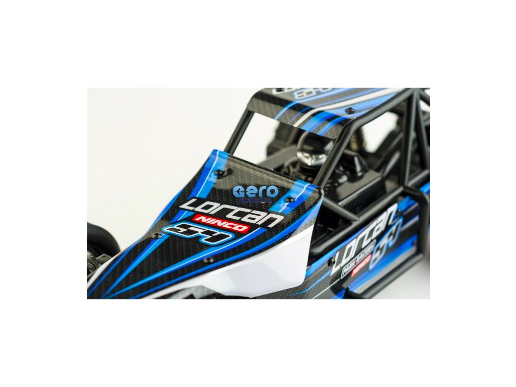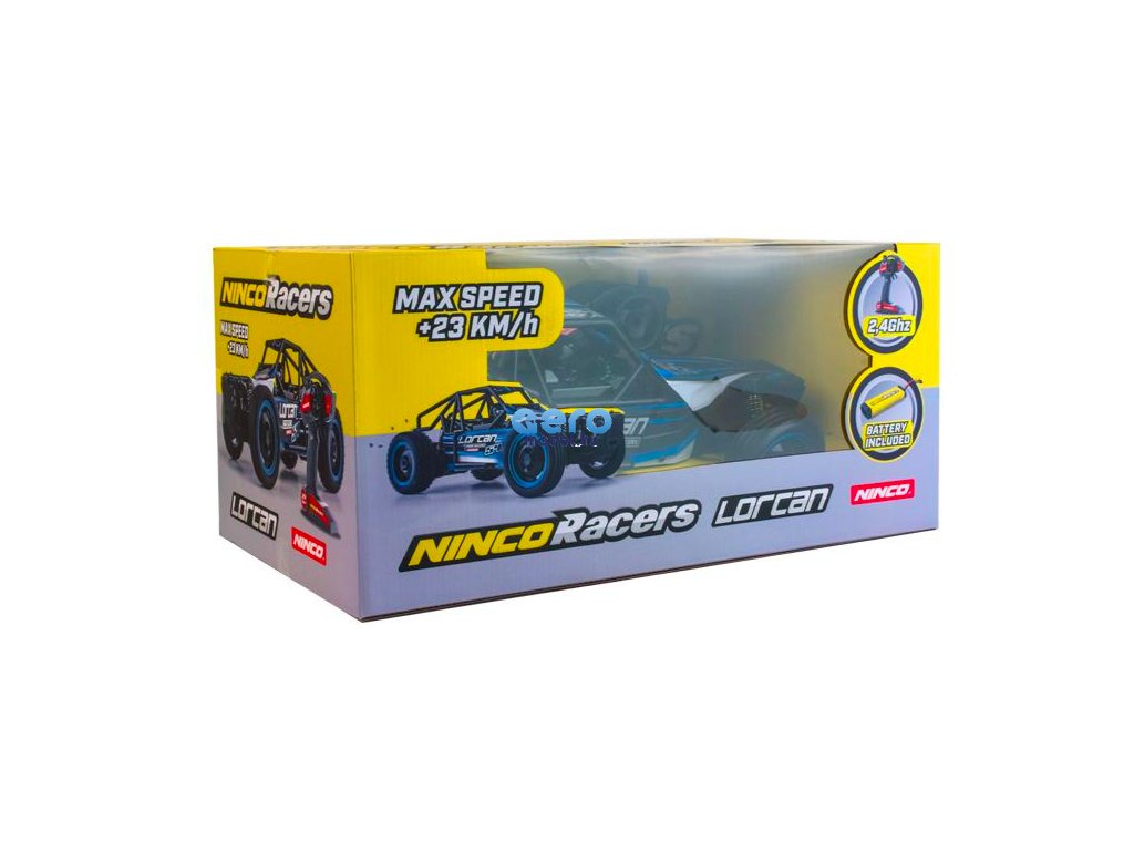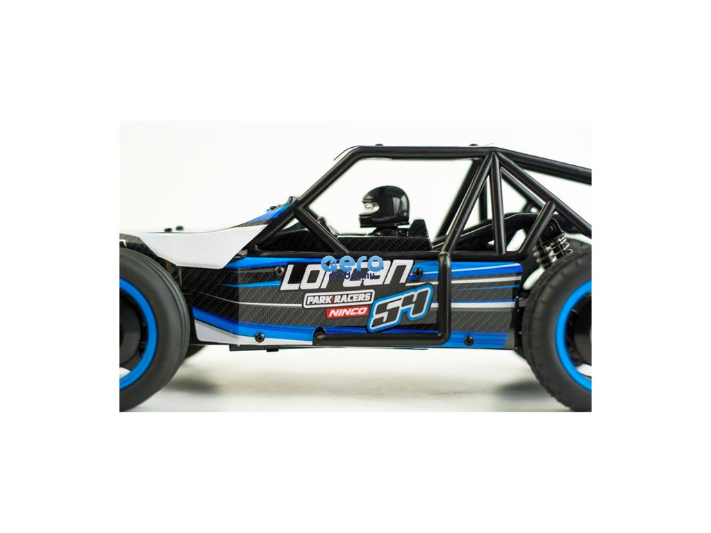 RC modell NINCORACERS Lorcan off-road Buggy 1:10 méretarányban bármilyen terepen készen áll. Az erőteljes egyirányú motor akár 20 kilométeres sebességgel hajtja meg a hátsó tengelyt. A speciális off-road hátsó gumiabroncsok kiváló tapadást tesznek lehetővé, az első abroncsokon pedig barázdák találhatók a pontos modellvezetés érdekében. A modell vázszerkezete tömör műanyag, karbon teste kék kiegészítőkkel.