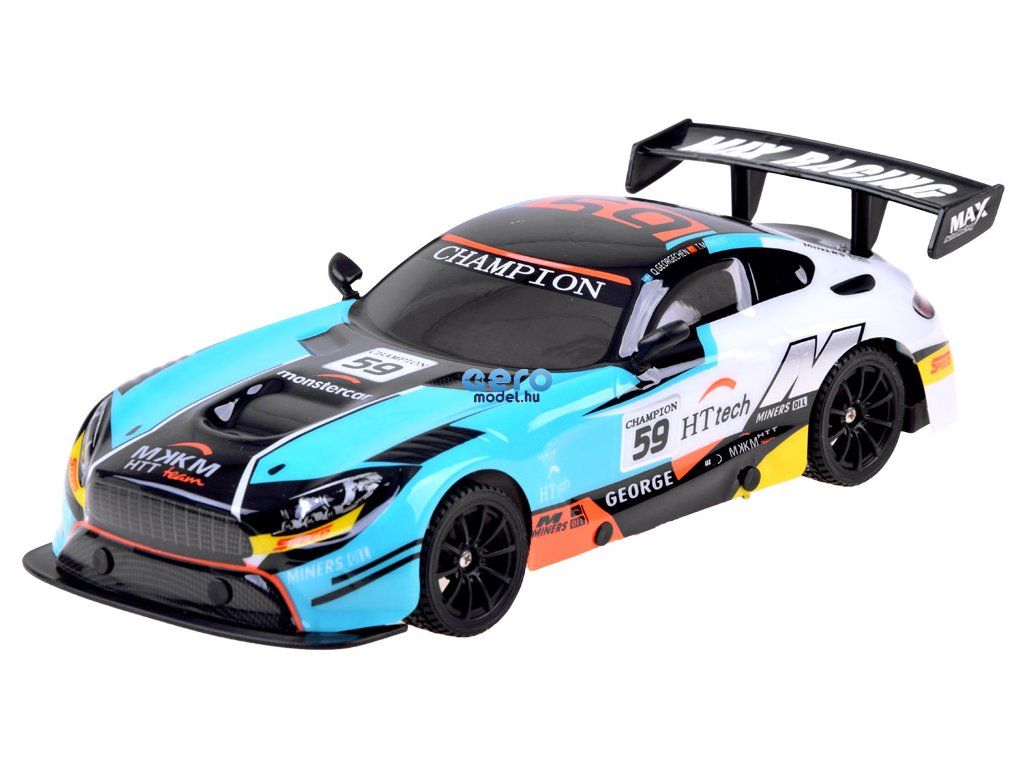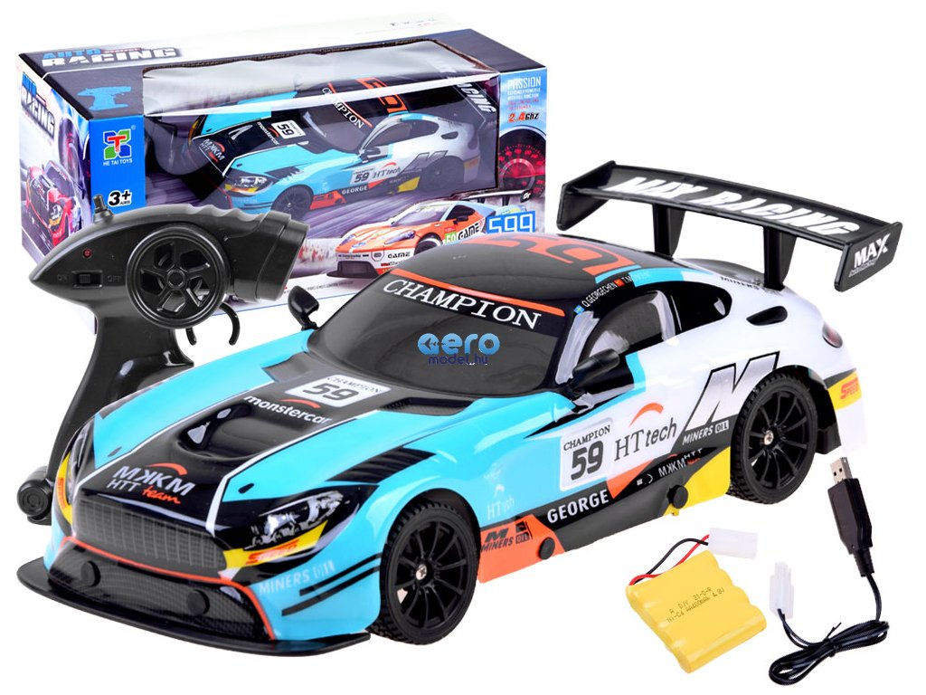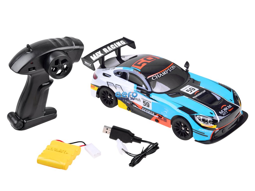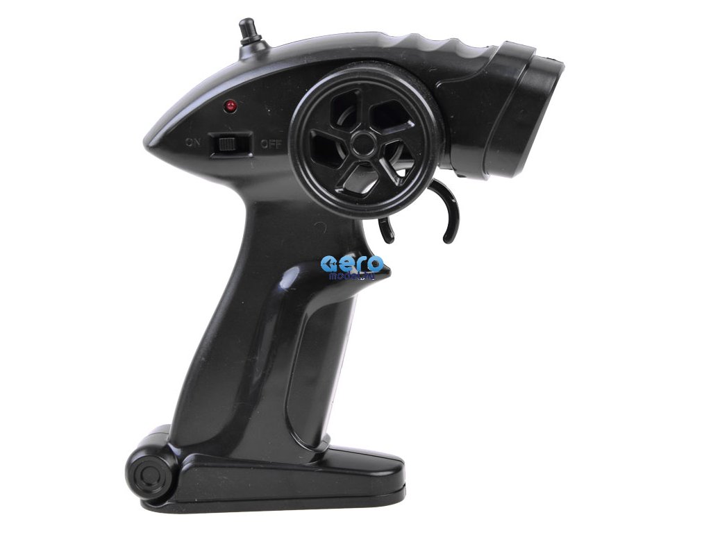 A gumis, széles abroncsok nagyon jól tapadnak a talajhoz, aminek köszönhetően az autó ügyesen behatol a kanyarokban. Az ergonomikus, 2,4 GHz-es távirányítóval vezérelt autó biztosítja a jármű kényelmes irányítását.