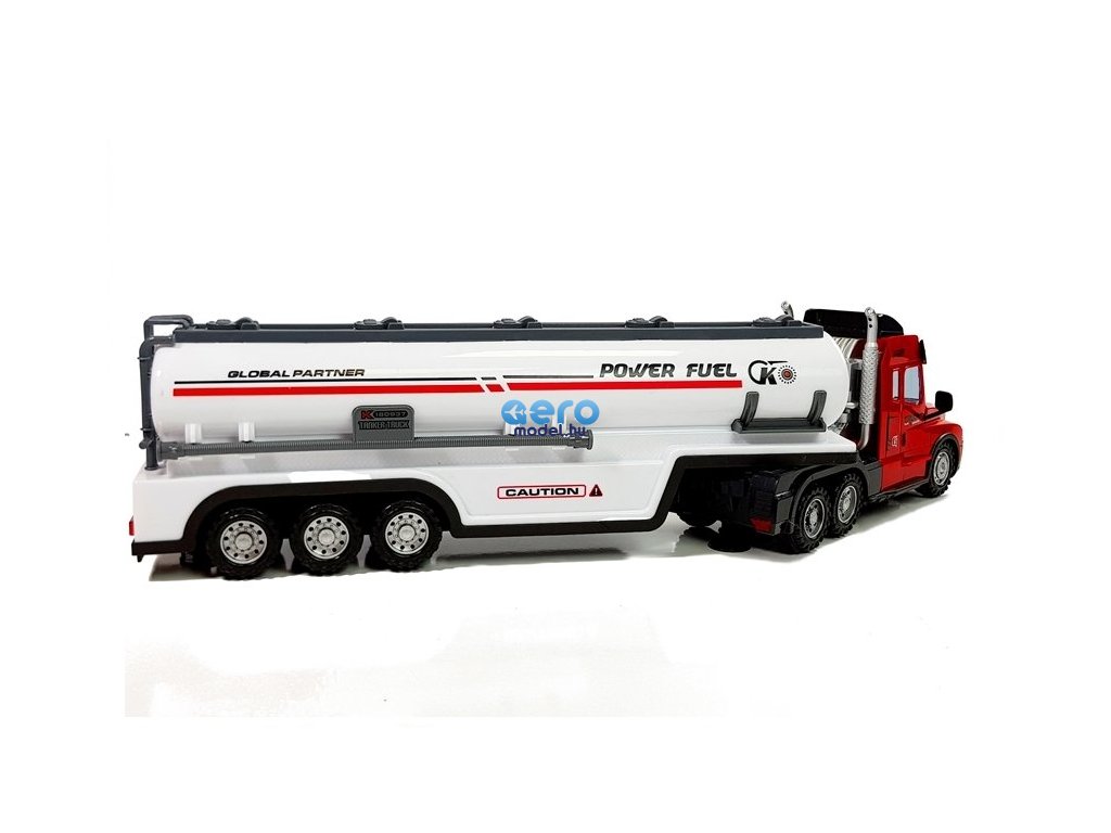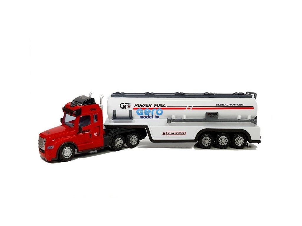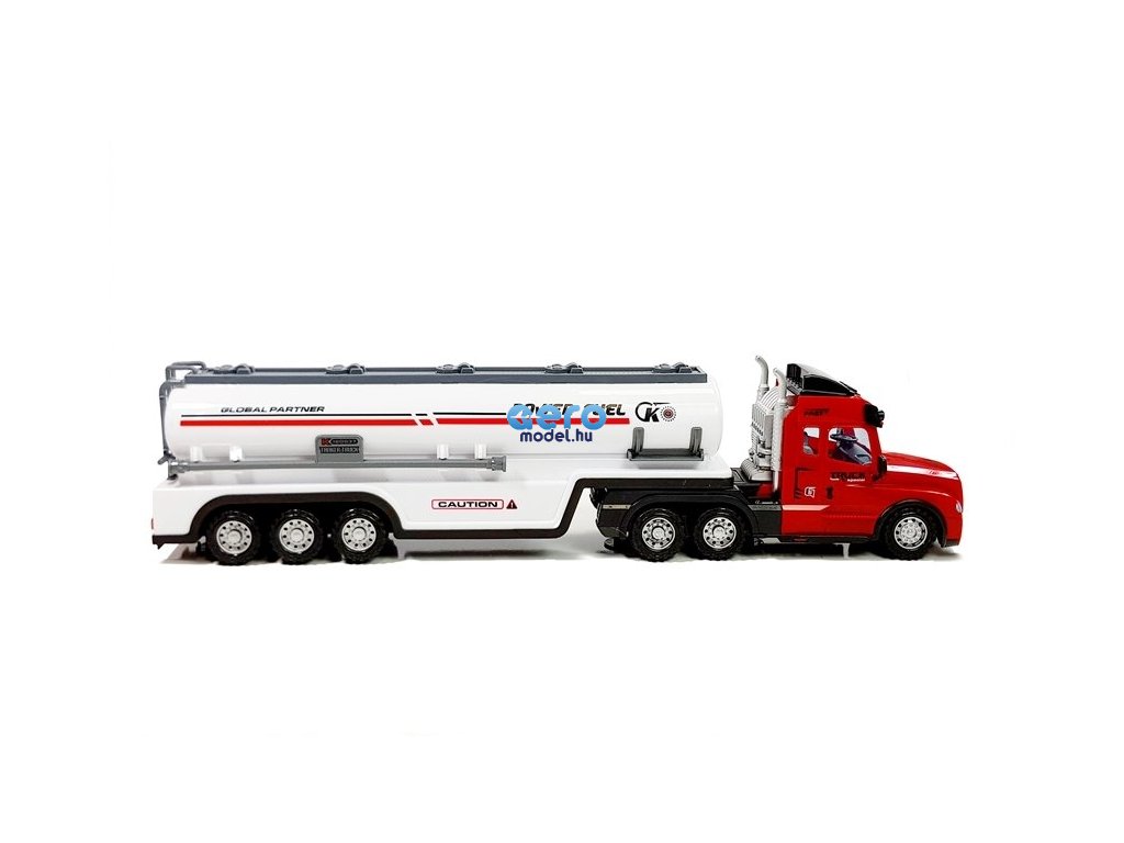 A piros fülkét fehér pótkocsival kontrasztos fekete részletek és jellegzetes matricák díszítik.