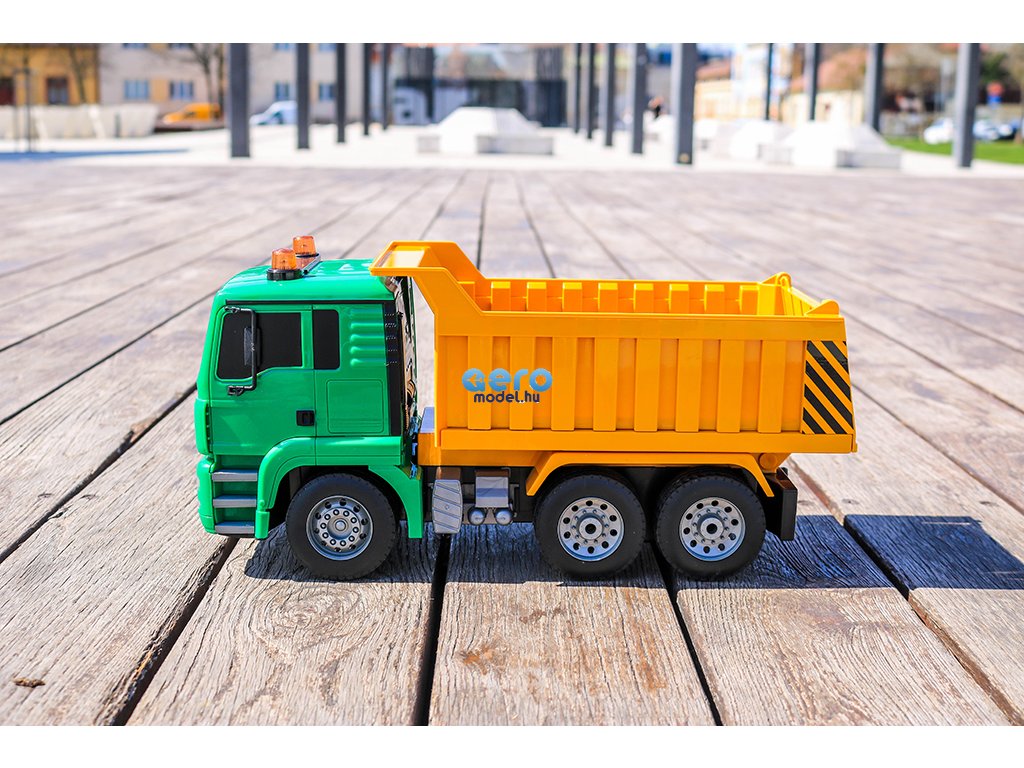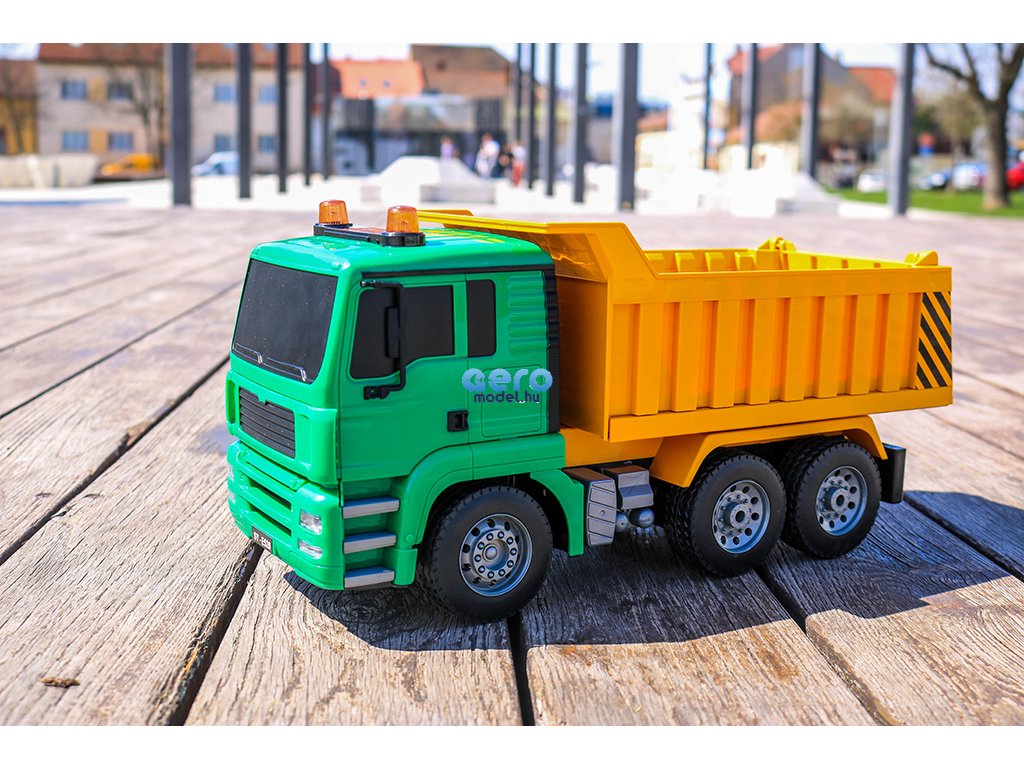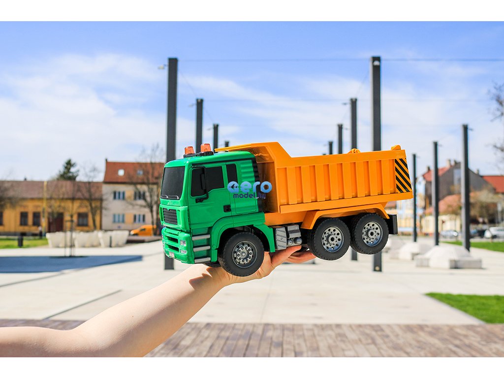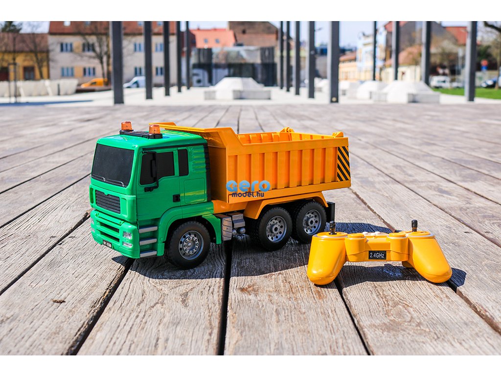 Ez a részletes feldolgozot engedélyezett RC billenőteherautó MAN Truck & Bus Group-től, készült 1: 20-as skálán, 27 MHz-en frekvencián működik , előre, hátra és fordul mint egy igazi autó. A modell 400 mAh-es újratölthető akkumulátorral működik, amely körülbelül 20 percig tart. A távirányító két AA elemre használható.