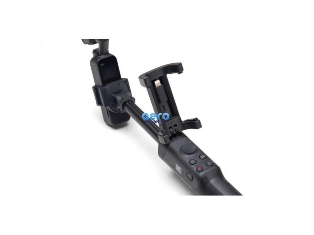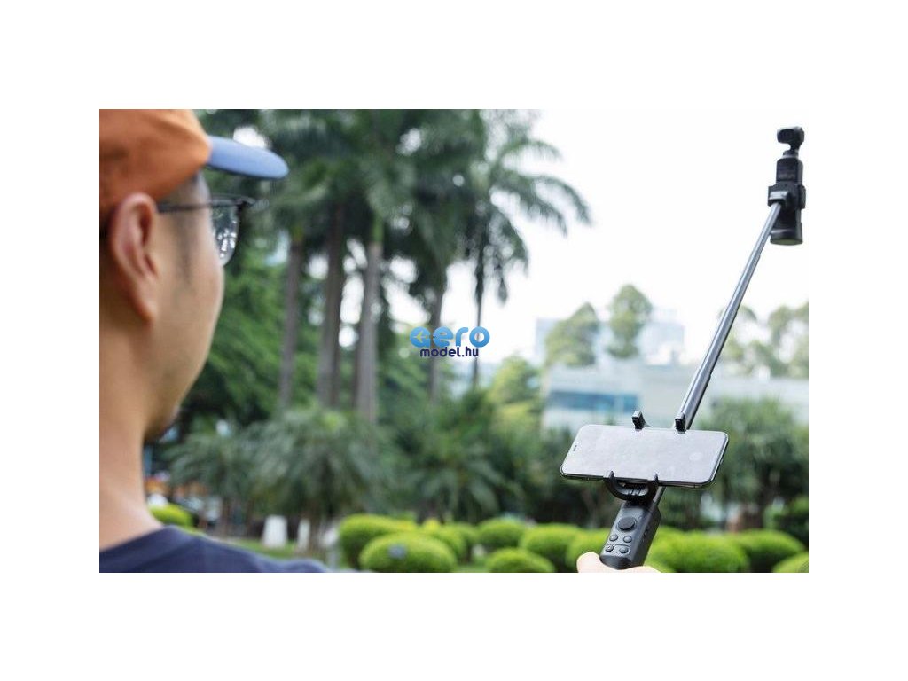A kihúzható hosszabbító rúd segítségével akár 50 cm-es hosszt is elérhetünk, a markolaton elhelyezett 6 gomb és távirányító kar segítségével precízen irányíthatjuk a gimbal mozgást, a rúd alján pedig szabványos 1/4" menet található. Csatlakoztathatja telefonját a telefontartóhoz, és az Osmo Pocket Wireless modul vagy csatlakozókábel segítségével (mindkettő külön kapható) válik lehetővé az Osmo Pocket hosszabbító rúddal történő vezérlés. A hosszabbító rúd több rögzítőelemmel is rendelkezik a további felvételi lehetőségekhez.