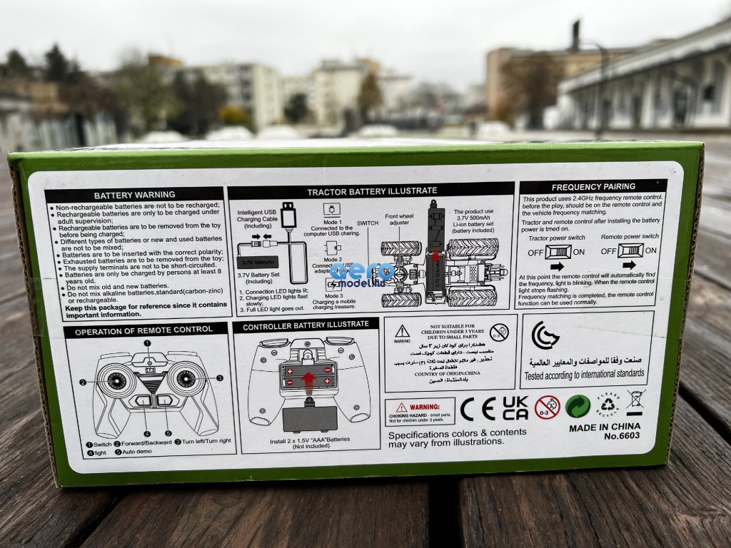 A csomag 3,7 V-os 500 mAh-s elemet tartalmaz a traktorba szerelve, míg a távirányítóhoz két darab 1,5 V-os AA elem szükséges, amelyeket nem tartalmaz. A jármű CE tanúsítvánnyal rendelkezik, és megfelel az EN 71 szabványnak is. A játék minden 3 év feletti gyermek számára alkalmas.